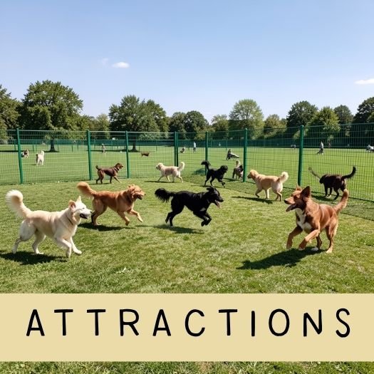 9 off-leash, fences sensory play zones separated by small dog, big dog, and human-only areas